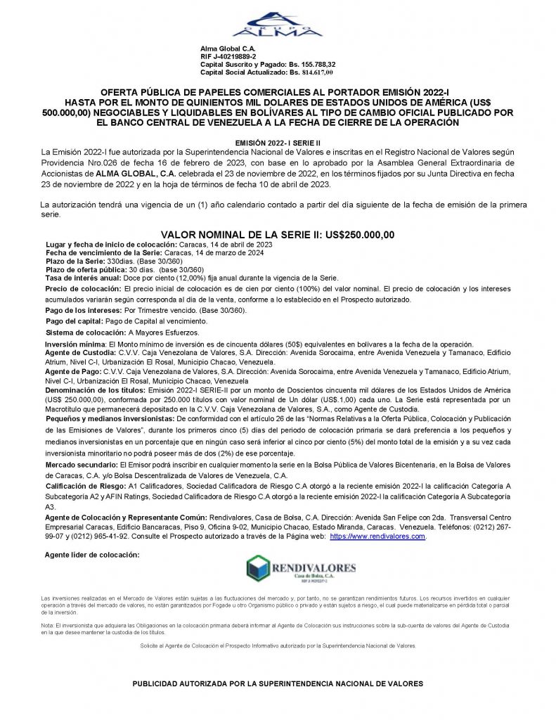 Los títulos para colocar son los correspondientes a la Serie II, Emisión 2022-I, de Papeles Comerciales al Portador, emitidos por la Empresa Emisora ALMA GLOBAL, C.A.