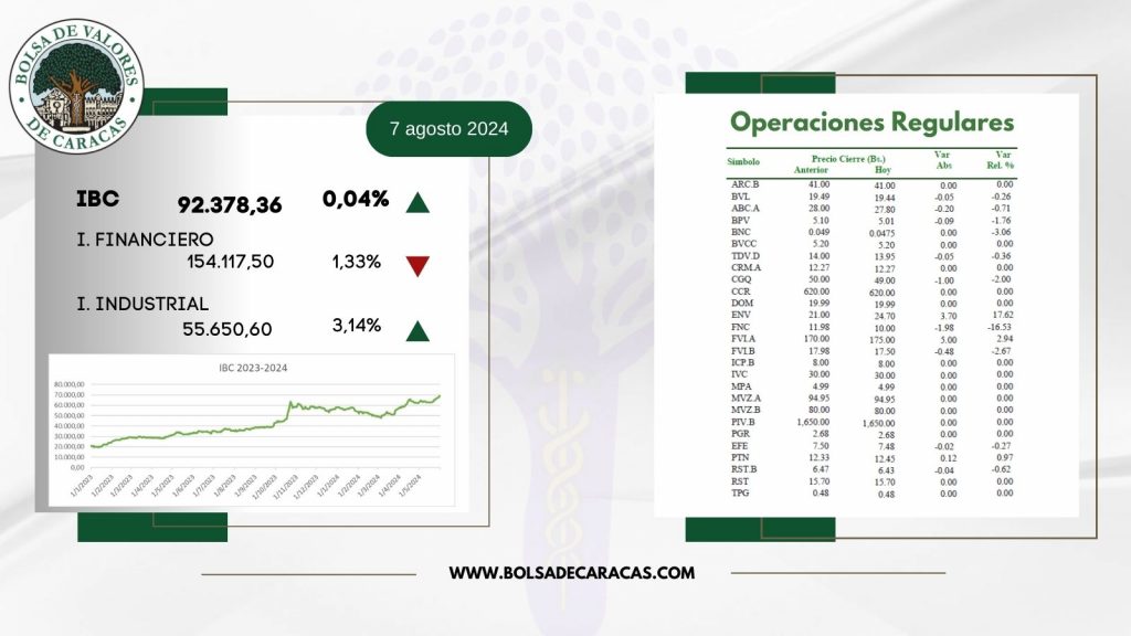 El índice principal de la Bolsa de Valores de Caracas, el IBC, culminó este miércoles en 92.378,36 puntos con una variación de 38,18 puntos (+0,04%), con respecto a la sesión anterior.