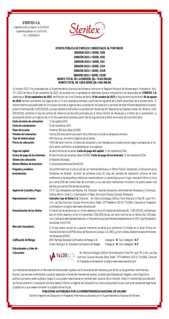 Los títulos que se colocaran son los correspondientes a las Series XXIII, XXIV, XXV, XXVI, XXVII y XXVIII de la Emisión 2023-I, de Papeles Comerciales al Portador, emitidos por la Empresa Emisora STERITEX, C.A.