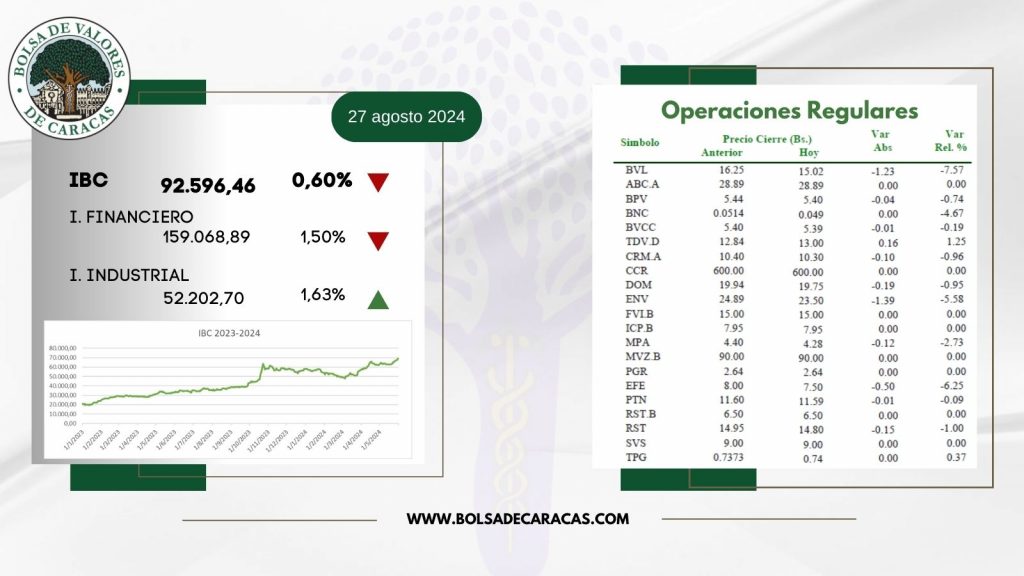 El índice principal de la Bolsa de Valores de Caracas, el IBC, culminó este martes en 92.596,46, con una variación absoluta de 554,78 puntos (-0,60%), con respecto a la sesión anterior.