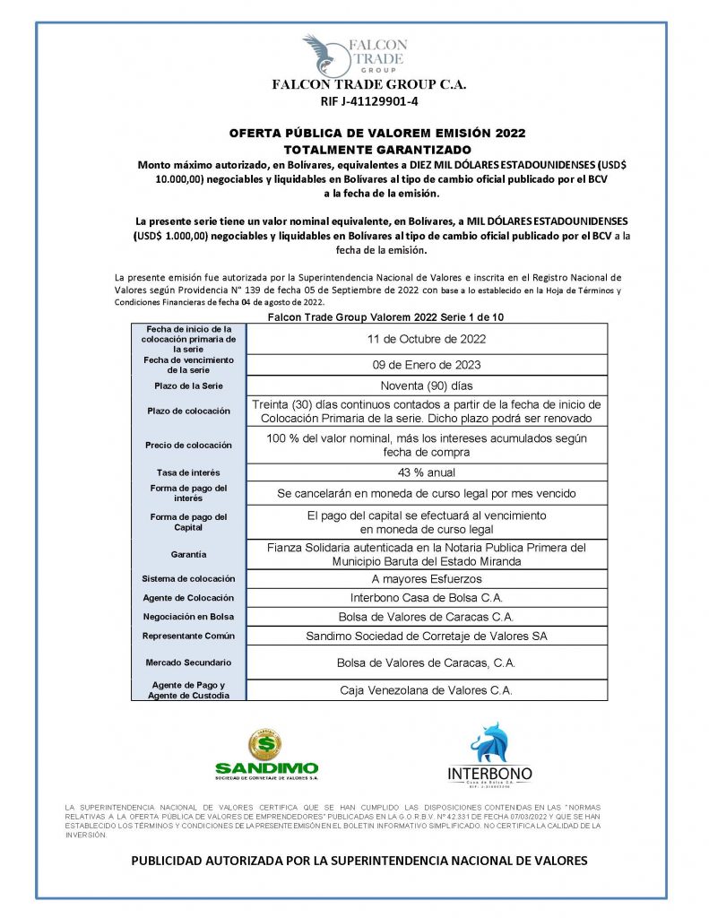 Los títulos para colocar son los correspondiente a la Serie I, de la Emisión 2022, de Valores de Emprendedores (VALOREM), de FALCON TRADE GROUP, C.A, con denominación en bolívares.