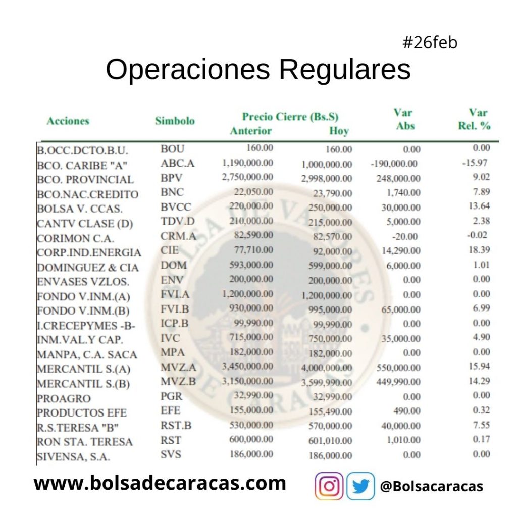 Se efectuaron 199 operaciones de compra y venta de acciones de las empresas inscritas en la pizarra de cotizaciones, en las cuales se transaron 364 mil 975 acciones por 57 mil 601 millones 736 mil 430 bolívares.