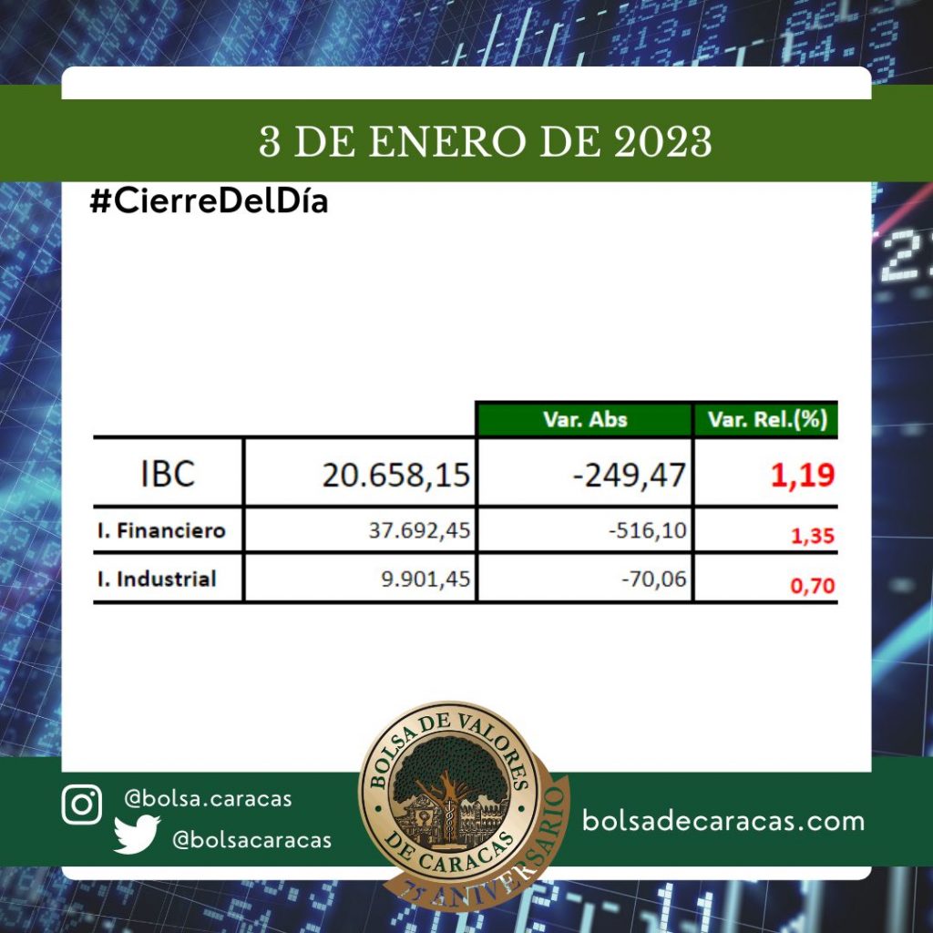 El índice principal de la Bolsa de Valores de Caracas, el IBC, culminó este martes en 20.658,15 puntos, con una variación absoluta de 249,47 puntos (-1,19%) con respecto a la sesión anterior.