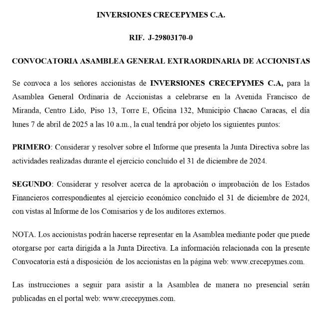 CRECEPYMES C.A, para la Asamblea General Ordinaria de Accionistas a celebrarse