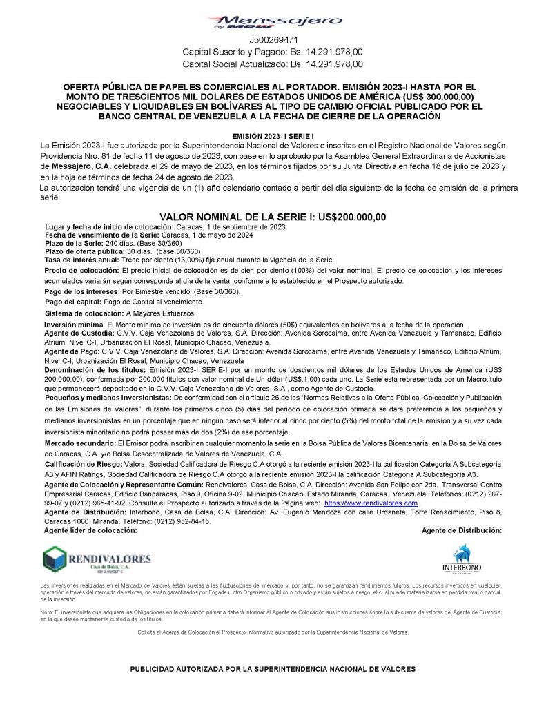 Los títulos para colocar son los correspondientes a la Serie I, de la Emisión 2023-I, de Papeles Comerciales de MENSSAJERO, C.A., con denominación en dólares de los Estados Unidos de América (USD$).