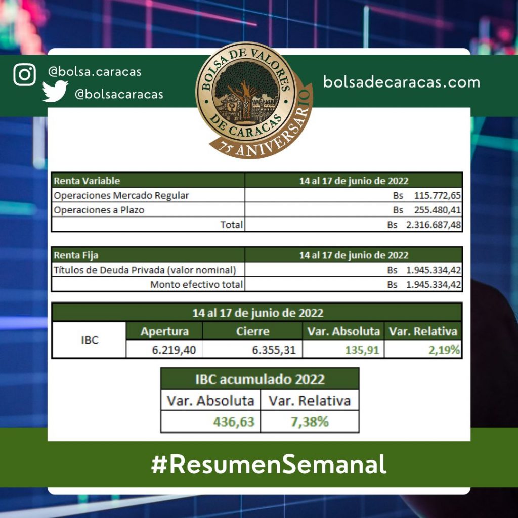 En la Bolsa de Valores de Caracas, entre el 14 y el 17 de junio de 2022, se negoció un total de 2 millones 316 mil 587 bolívares.