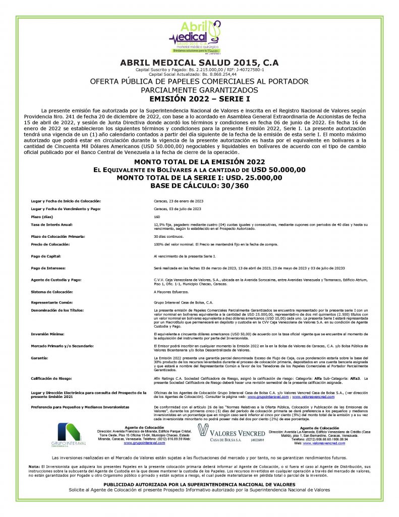 Los títulos para colocar son los correspondientes a la Serie I, de la Emisión 2022, de Papeles Comerciales de ABRIL MEDICAL SALUD 2015, C.A., por un monto de (USD$ 25.000,00), de dólares de los Estados Unidos de América.