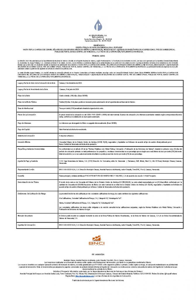 Los títulos para colocar son los correspondiente a la Serie I, de la Emisión 2023-I, de Papeles Comerciales al Portador, emitidos por la Empresa Emisora ACQUA FONTANA, C. A., con denominación en dólares de los Estados Unidos de América (USD$), negociables y liquidables en bolívares.