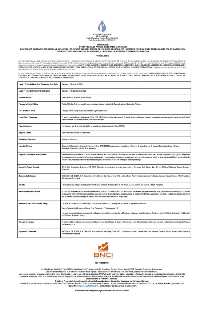 La Bolsa de Valores de Caracas, en su carácter institucional por promover el Mercado de Valores de Renta Fija del sector primario, informa a los Miembros de la Bolsa de Valores de Caracas y al público en general, sobre las características y condiciones de la Colocación Primaria de Papeles Comerciales al Portador de ACQUA FONTANA, C. A., a realizarse a través del Sistema Integrado Bursátil Electrónico (SIBE).