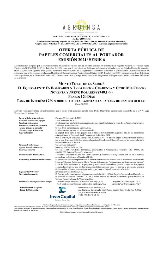 | Emisor | AGROPECUARIA INSA DE VENEZUELA (AGROINSA), C.A. |