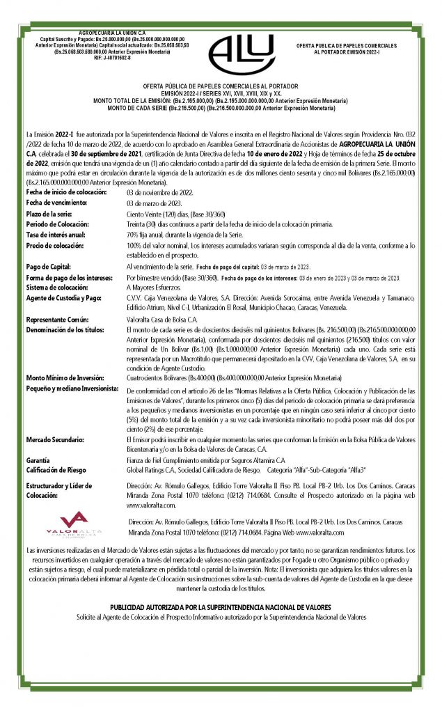 | Emisor | AGROPECUARIA LA UNIÓN, C.A., |