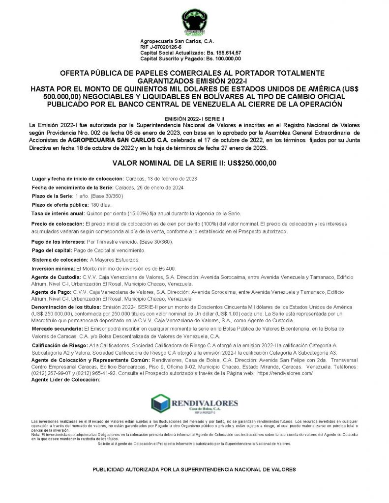 Colocación Primaria de Papeles Comerciales Emisión 2022-I Serie II Monto USD$. 250.000,00 NEGOCIABLES Y LIQUIDABLES EN BOLÍVARES AL TIPO DE CAMBIO OFICIAL PUBLICADO POR EL BANCO CENTRAL DE VENEZUELA AL CIERRE DE LA OPERACIÓN