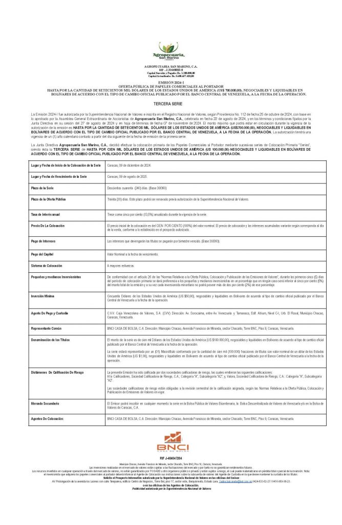 Colocación Primaria de Papeles Comerciales al Portador Emisión 2024-I Serie III, Monto USD$ 100.000,00 NEGOCIABLES Y LIQUIDABLES EN BOLÍVARES DE ACUERDO CON EL TIPO DE CAMBIO OFICIAL PUBLICADO POR EL BANCO CENTRAL DE VENEZUELA, A LA FECHA DE LA OPERACIÓN.