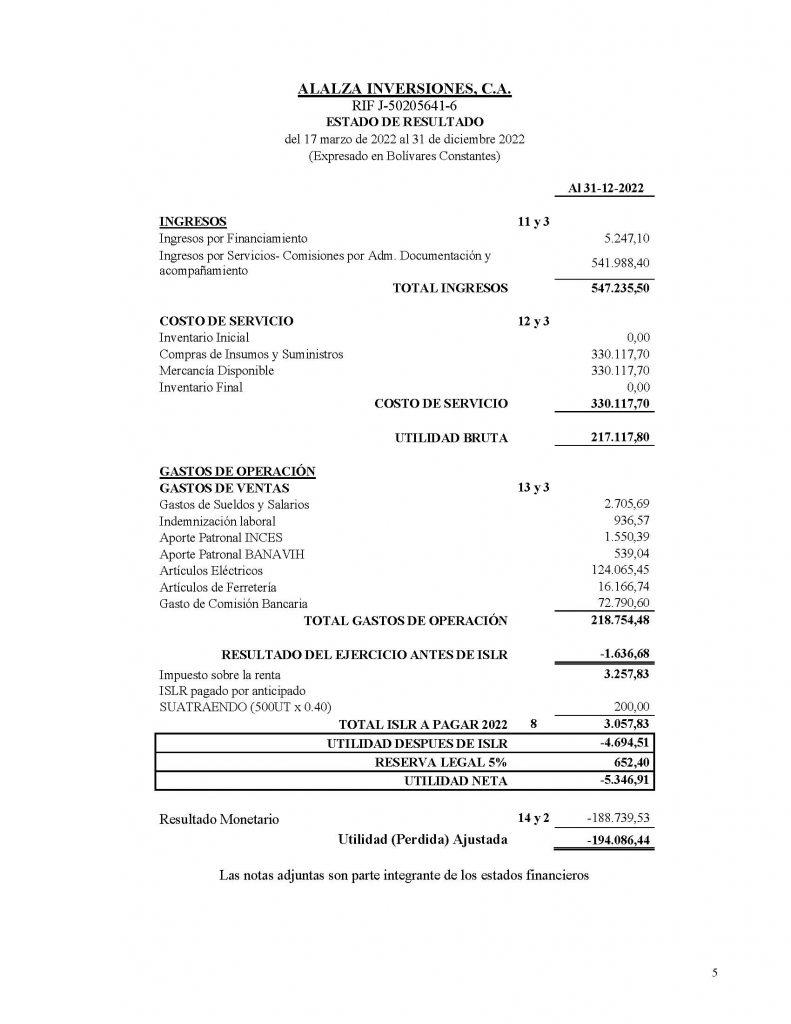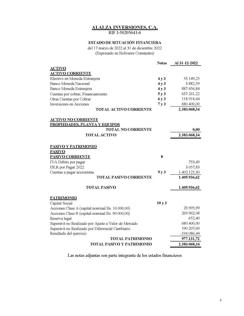 ALALZA INVERSIONES C.A. INFORMACIÓN FINANCIERA DEL 17 MARZO AL 31 DE DICIEMBRE DE 2022 AUDITADO