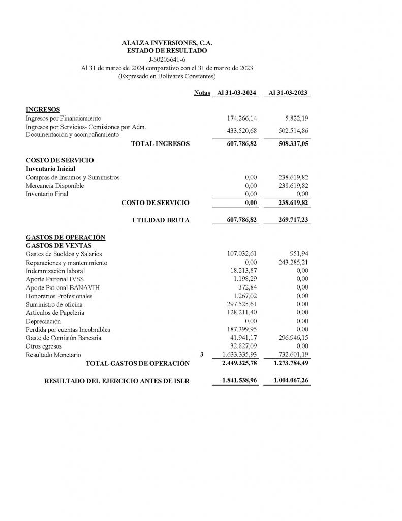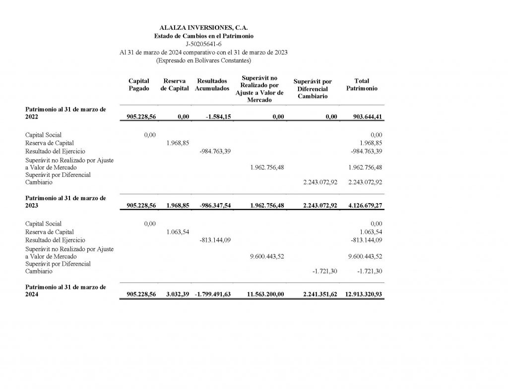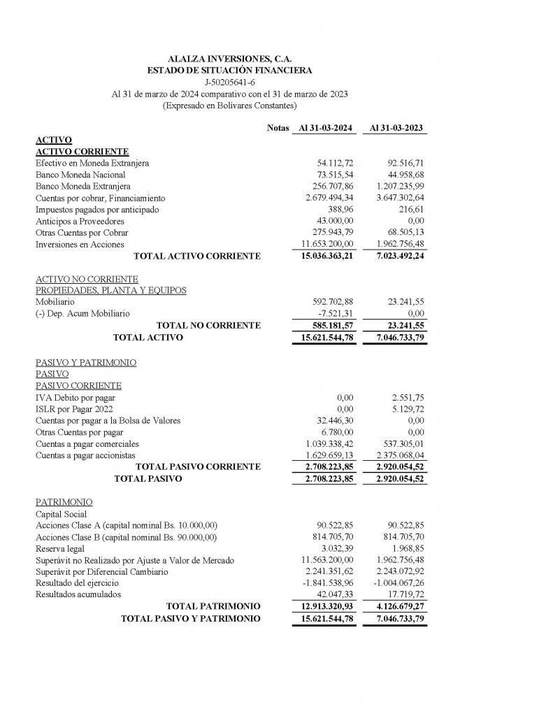 Estado de Situación Financiera, Estado de Resultado y Estado de Cambios en el Patrimonio financieros al 31 de Marzo de 2024 comparativo con el 31 de Marzo de 2023 de Alalza Inversiones CA