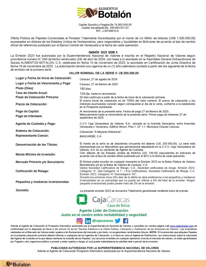 Los títulos para colocar son los correspondientes a la Serie II, de la Emisión 2023, de Papeles Comerciales de ALIMENTOS BOTALÓN, C.A., con denominación en dólares de los Estados Unidos de América (USD$). Negociables y Liquidables en bolívares.