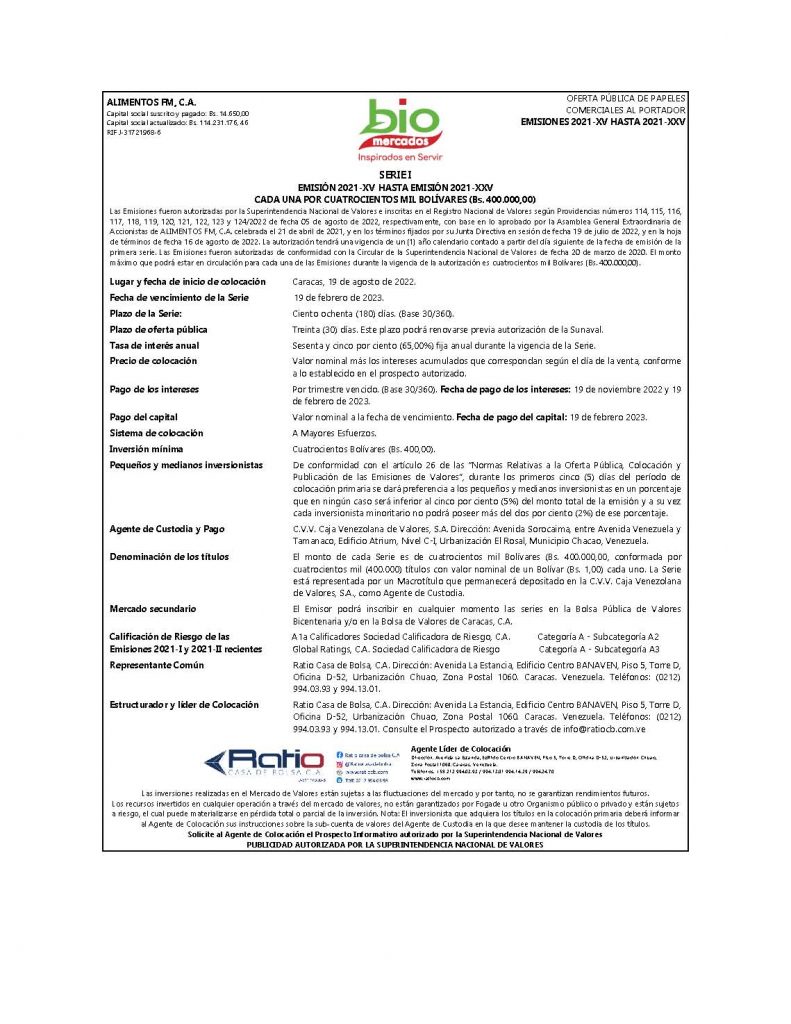Los títulos para colocar son los correspondientes a la Serie I, de las Emisiones 2021-XV hasta la 2021-XXV, de Papeles Comerciales al Portador, emitidos por la Empresa Emisora ALIMENTOS FM, C.A.