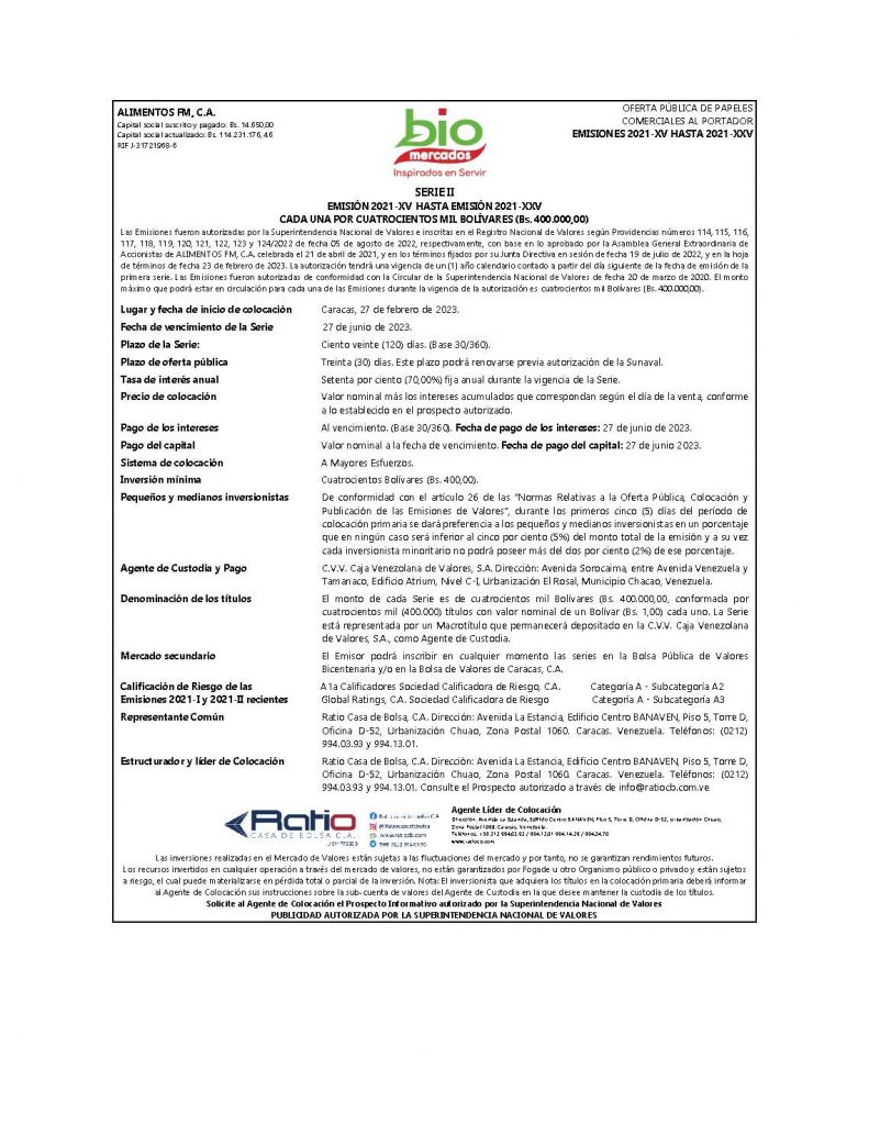 Los títulos para colocar son los correspondientes a la Serie II, de las Emisiones 2021-XV hasta la 2021-XXV, de Papeles Comerciales al Portador, emitidos por la Empresa Emisora ALIMENTOS FM, C.A.