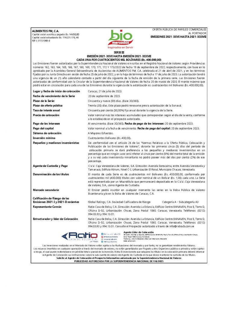 Los títulos para colocar son los correspondientes a la Serie III, de las Emisiones 2021-XXVI hasta la 2021-XXXVII, de Papeles Comerciales al Portador, emitidos por la Empresa Emisora ALIMENTOS FM, C.A.