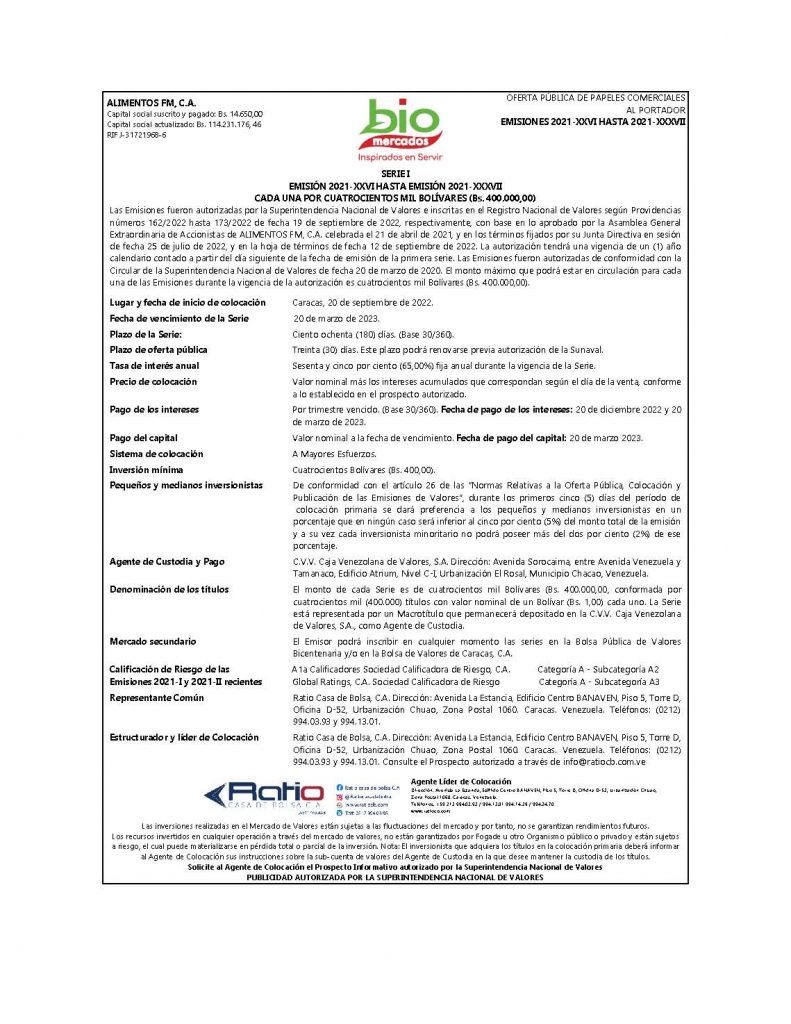 Los títulos para colocar son los correspondientes a la Serie I, de las Emisiones 2021-XXVI hasta la 2021-XXXVII, de Papeles Comerciales al Portador, emitidos por la Empresa Emisora ALIMENTOS FM, C.A.