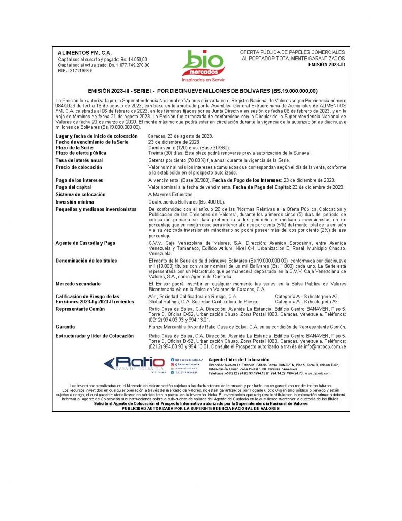 Los títulos para colocar son los correspondientes a la Serie I, de las Emisión 2023-III, de Papeles Comerciales al Portador, emitidos por la Empresa Emisora ALIMENTOS FM, C.A.