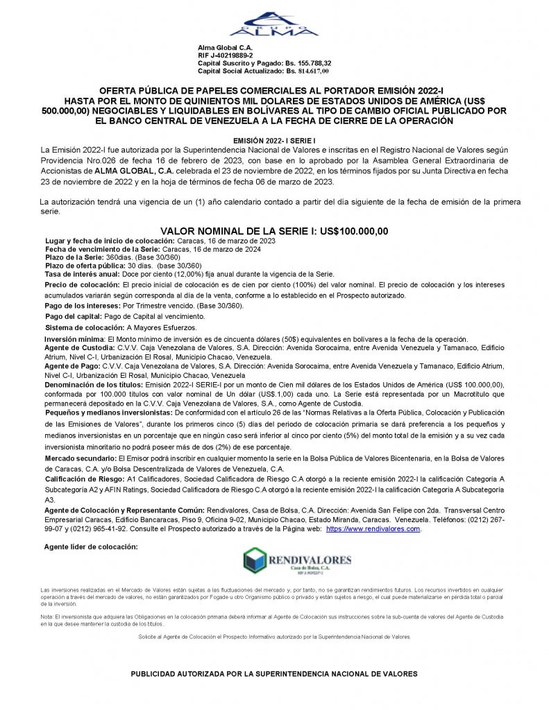 Los títulos para colocar son los correspondientes a la Serie I, Emisión 2022-I, de Papeles Comerciales al Portador, emitidos por la Empresa Emisora ALMA GLOBAL, C.A.