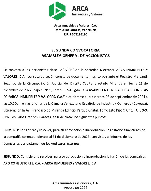 Se convoca a los accionistas clase “A” y “B” de la Sociedad Mercantil ARCA INMUEBLES Y VALORES, C.A., constituida según consta de documento inscrito por ante el Registro Mercantil Segundo de la Circunscripción Judicial del Distrito Capital y estado Miranda en fecha 21 de diciembre de 2022, bajo el Nº 1, Tomo 602-A-5gdo, a la ASAMBLEA GENERAL DE ACCIONISTAS DE “ARCA INMUEBLES Y VALORES, CA.” a celebrarse el dia viernes 06 de septiembre de 2024 a las 10:00am en las oficinas de la Cámara Venezolano-Española de Industria y Comercio (Cavespa), ubicadas en la Av. Francisco de Miranda Edificio Parque Cristal, Torre Este Piso 9 Ofic. TOP, 9-9, Urb. Los Palos Grandes, Caracas; a fin de tratar los siguientes puntos: