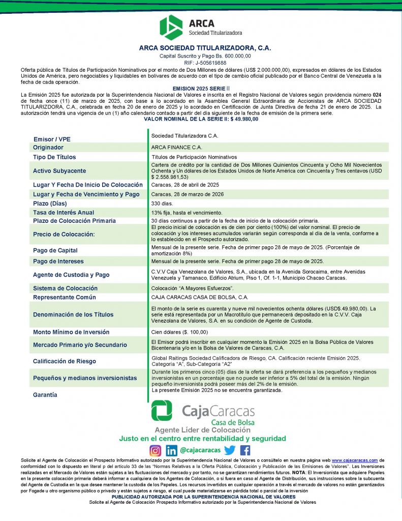 ARCA SOCIEDAD TITULARIZADORA, C.A., TITULOS DE PARTICIPACIÓN NOMINATIVOS EMISIÓN 2025 SERIE II