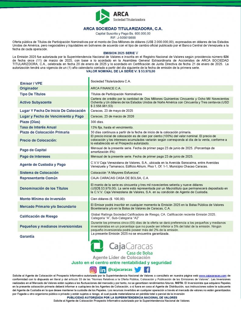 Los títulos para colocar son los correspondiente, a la Serie V, por un monto de USD. 53.979,00, de la Emisión 2025, de Títulos de Participación Nominativos, emitidos por la Empresa Emisora ARCA SOCIEDAD TITULARIZADORA, C.A.