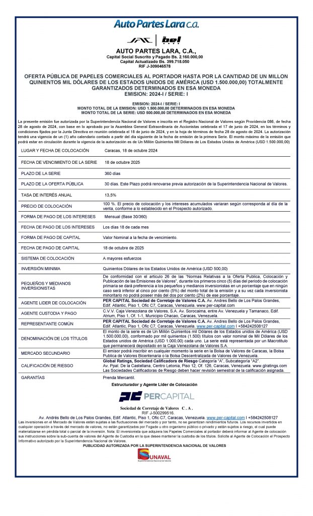 | Emisor | AUTO PARTES LARA, C.A. |