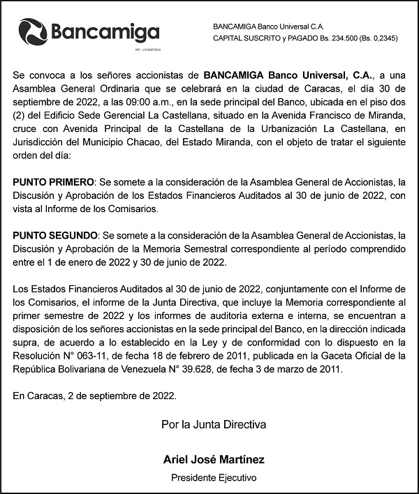 Se convoca a los señores accionistas de BANCAMIGA Banco Universal, C.A., a una Asamblea General Ordinaria que se celebrará en la ciudad de Caracas, el día 30 de septiembre de 2022, a las 09:00 a.m., en la sede principal del Banco, ubicada en el piso dos (2) del Edificio Sede Gerencial La Castellana, situado en la Avenida Francisco de Miranda, cruce con Avenida Principal de la Castellana de la Urbanización La Castellana, en Jurisdicción del Municipio Chacao, del Estado Miranda, con el objeto de tratar el siguiente orden del día: