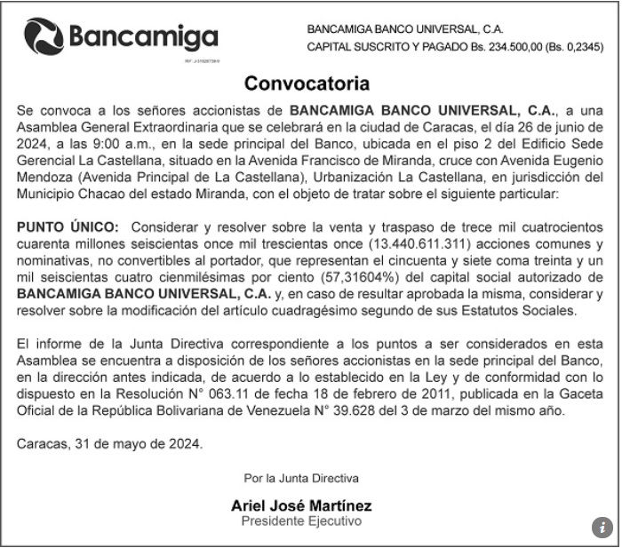 Se convoca a los señores accionistas de BANCAMIGA BANCO UNIVERSAL, C.A., a una Asamblea General Extraordinaria que se celebrará en la ciudad de Caracas, el día 26 de junio de 2024, a las 9:00 a.m., en la sede principal del Banco, ubicada en el piso 2 del Edificio Sede Gerencial La Castellana, situado en la Avenida Francisco de Miranda, cruce con Avenida Eugenio Mendoza (Avenida Principal de La Castellana), Urbanización La Castellana, en jurisdicción del Municipio Chacao del estado Miranda, con el objeto de tratar sobre el siguiente particular: