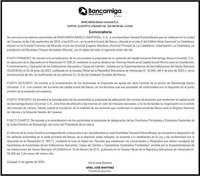 Se convoca a los señores accionistas de BANCAMIGA Banco Universal, C.A., a una Asamblea General Extraordinaria quo se celebrará en la ciudad de Caracas, el día 2 de septiembre de 2024, a las 9:00 a.m., en la sede principal del Banco, ubicada en el piso dos (2) del Edificio Sede Gerencial La Castellana, situado en la Avenida Francisco de Miranda, cruce con Avenida Principal de la Castellana de la Urbanización La Castellana, en Jurisdicción del Municipio Chacao, del Estado Miranda, con el objeto de tratar el siguiente orden del día: