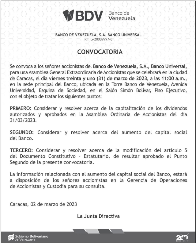 Se convoca a los señores accionistas del Banco de Venezuela, S.A., Banco Universal, para una Asamblea General Extraordinaria de Accionistas que se celebrará en la ciudad de Caracas, el viernes treinta y uno (31) de marzo de 2023, a las 11:00 am., en la sede principal del Banco, ubicada en la Torre Banco de Venezuela, Avenida Universidad, Esquina de Sociedad, en el Salón Simón Bolívar, Piso Ejecutivo, con el objeto de tratar los siguientes puntos:
