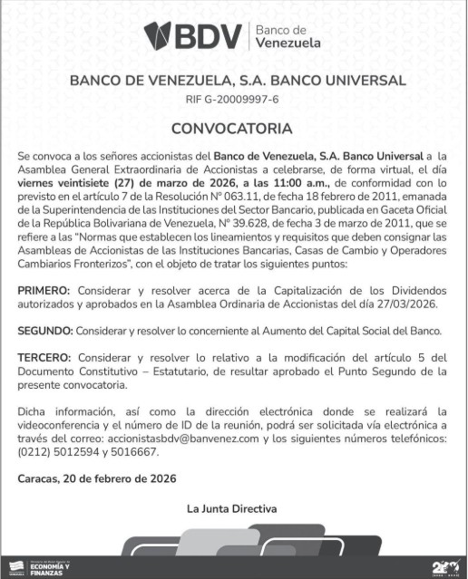 Se convoca a los señores accionistas del Banco de Venezuela, S.A., Banco Universal, a la Asamblea General Extraordinaria de Accionistas a celebrarse, de forma virtual, el día viernes, veintisiete (27) de marzo de 2026, a las 11:00 a.m., de conformidad con lo previsto en el artículo 7 de la Resolución Nro. 063.11, de fecha 18 de febrero de 2011, emanada de la Superintendencia de las Instituciones del Sector Bancario, publicada en Gaceta Oficial de la República Bolivariana de Venezuela Nro. 39.628, de fecha 3 de marzo de 2011, que se refiere a las Normas que establecen los lineamientos y requisitos que deben consignar las Asambleas de Accionistas de las Instituciones Bancarias, Casa de Cambio y Operadores Cambiarios Fronterizos, con el objeto de tratar los siguientes puntos: