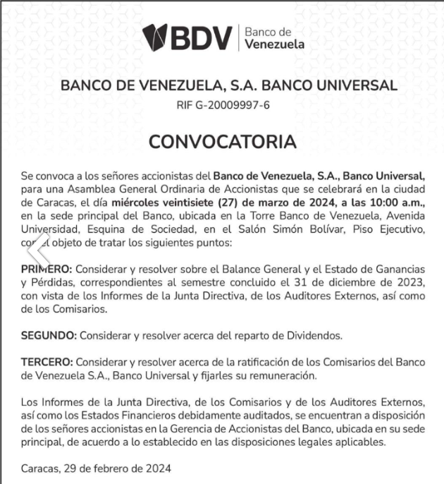 Se convoca a los señores accionistas del Banco de Venezuela, S.A., Banco Universal, para una Asamblea General Ordinaria de Accionistas que se celebrará en la ciudad de Caracas, el miércoles veintisiete (27) de marzo de 2024, a las 10:00 a.m., en la sede principal del Banco, ubicada en la Torre Banco de Venezuela, Avenida Universidad, Esquina de Sociedad, en el Salón Simón Bolívar, Piso Ejecutivo, con objeto de tratar los siguientes puntos: