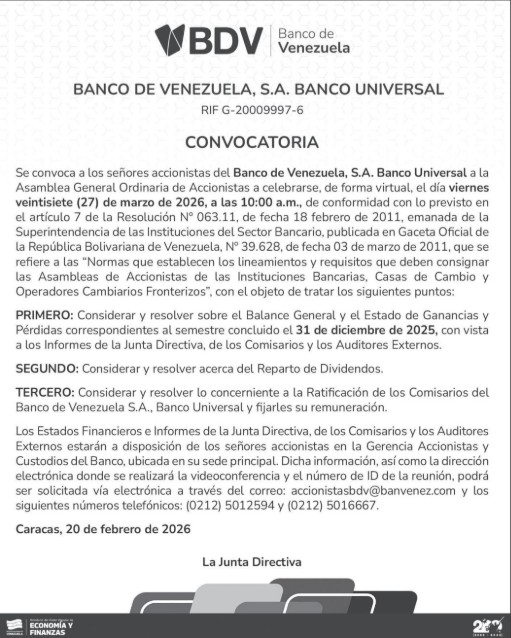 Se convoca a los señores accionistas del Banco de Venezuela, S.A., Banco Universal, a la Asamblea General Ordinaria de Accionistas a celebrarse, de forma virtual, el día viernes, veintisiete (27) de marzo de 2026, a las 10:00 a.m., de conformidad con lo previsto en el artículo 7 de la Resolución Nro. 063.11, de fecha 18 de febrero de 2011, emanada de la Superintendencia de las Instituciones del Sector Bancario, publicada en Gaceta Oficial de la República Bolivariana de Venezuela Nro. 39.628, de fecha 3 de marzo de 2011, que se refiere a las Normas que establecen los lineamientos y requisitos que deben consignar las Asambleas de Accionistas de las Instituciones Bancarias, Casa de Cambio y Operadores Cambiarios Fronterizos, con el objeto de tratar los siguientes puntos: