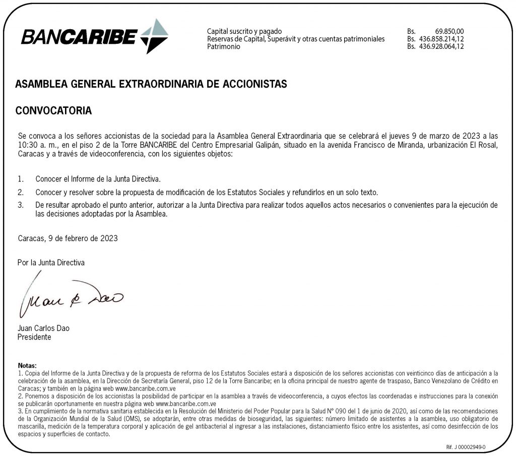 Se convoca a los señores accionistas de la sociedad para la Asamblea General Extraordinaria que se celebrará el jueves 9 de marzo de 2023 a las 10:30 a.m., en el piso 2 de la Torre BANCARIBE del Centro Empresarial Galipán, situado en la avenida Francisco de Miranda, urbanización El Rosal, Caracas y a través de videoconferencia, con los siguientes objetos: