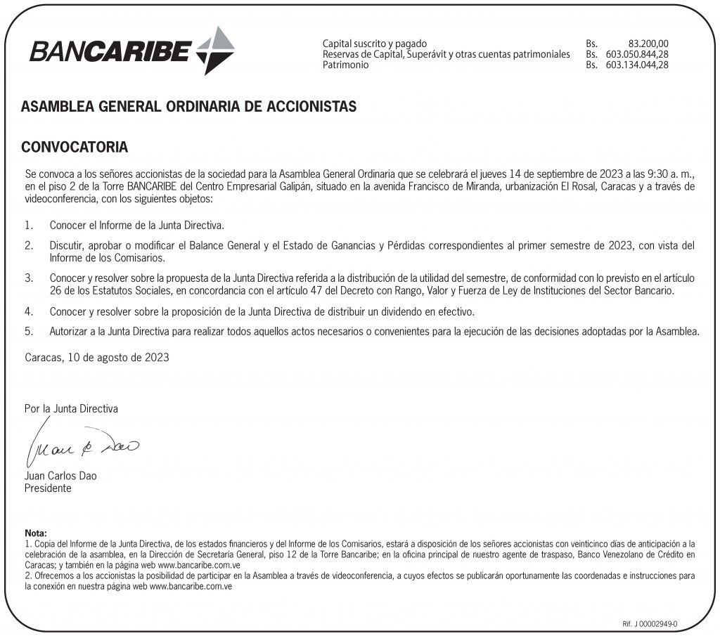 BANCO DEL CARIBE C.A., BANCO UNIVERSAL (BANCARIBE) ASAMBLEA GENERAL ORDINARIA DE ACCIONISTAS A CELEBRARSE EL 14 DE SEPTIEMBRE DE 2023
