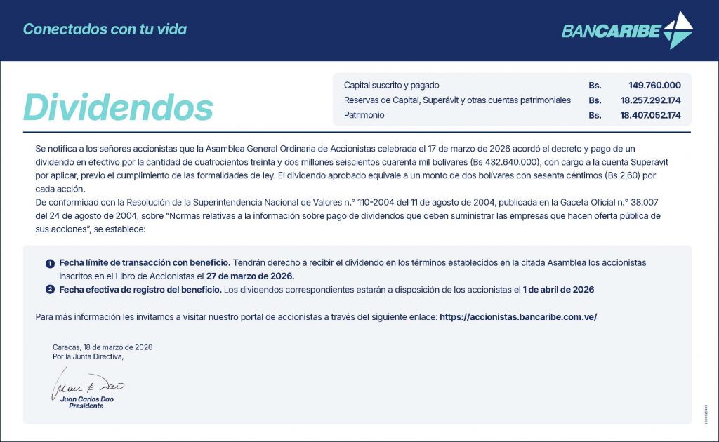 Se notifica a los señores accionistas que la Asamblea General Ordinaria de Accionistas celebrada el 17 de marzo de 2026 acordó el decreto y pago de un dividendo en efectivo por la cantidad de cuatrocientos treinta y dos millones seiscientos cuarenta mil bolívares (BS. 432.640.000) con cargo a la cuenta Superávit por aplicar, previo el cumplimiento de las formalidades de ley. El dividendo aprobado equivale a un monto de dos bolívares con sesenta céntimos Bs. 2,60 por cada acción.