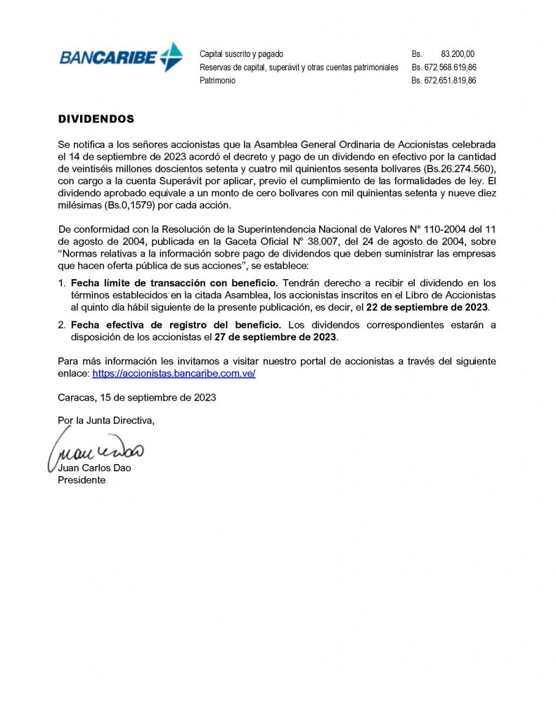 Se notifica a los señores accionistas que la Asamblea General Ordinaria de Accionistas celebrada el 14 de septiembre de 2023 acordó el decreto y pago de un dividendo en efectivo por la cantidad de veintiséis millones doscientos setenta y cuatro mil quinientos sesenta bolívares (Bs.26.274.560), con cargo a la cuenta Superávit por aplicar, previo el cumplimiento de las formalidades de ley. El dividendo aprobado equivale a un monto de cero bolívares con mil quinientas setenta y nueve diez milésimas (Bs.0,1579) por cada acción.