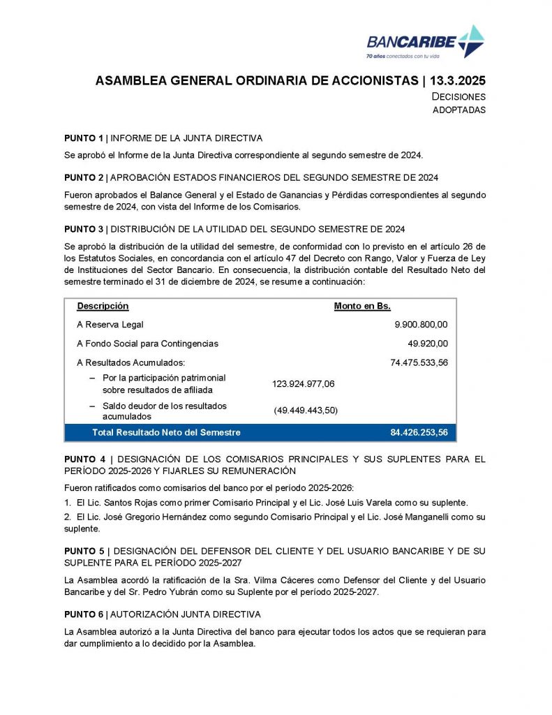 PUNTO 3 | DISTRIBUCIÓN DE LA UTILIDAD DEL SEGUNDO SEMESTRE DE 2024 Se aprobó la distribución de la utilidad del semestre, de conformidad con lo previsto en el artículo 26 de los Estatutos Sociales, en concordancia con el artículo 47 del Decreto con Rango, Valor y Fuerza de Ley de Instituciones del Sector Bancario. En consecuencia, la distribución contable del Resultado Neto del semestre terminado el 31 de diciembre de 2024, se resume a continuación