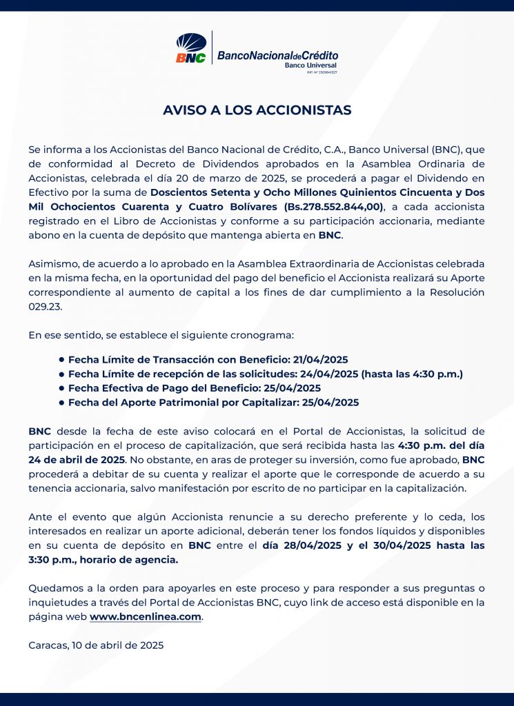 Se informa a los Accionistas del Banco Nacional de Crédito, C.A., Banco Universal (BNC), que de conformidad al Decreto de Dividendos aprobados en la Asamblea Ordinaria de Accionistas, celebrada el día 20 de marzo de 2025, se procederá a pagar el Dividendo en Efectivo por la suma de Doscientos Setenta y Ocho Millones Quinientos Cincuenta y Dos Mil Ochocientos Cuarenta y Cuatro Bolívares (Bs.278.552.844,00), a cada accionista registrado en el Libro de Accionistas y conforme a su participación accionaria, mediante abono en la cuenta de depósito que mantenga abierta en BNC.