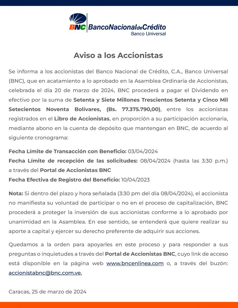Se informa a los accionistas del Banco Nacional de Crédito, C.A., Banco Universal (BNC), que en acatamiento a lo aprobado en la Asamblea Ordinaria de Accionistas, celebrada el día 20 de marzo de 2024, BNC procederá a pagar el Dividendo en efectivo por la suma de Setenta y Siete Millones Trescientos Setenta y Cinco Mil Setecientos Noventa Bolivares, (Bs. 77.375.790,00), entre los accionistas registrados en el Libro de Accionistas, en proporción a su participación accionaria, mediante abono en la cuenta de depósito que mantengan en BNC, de acuerdo al siguiente cronograma: