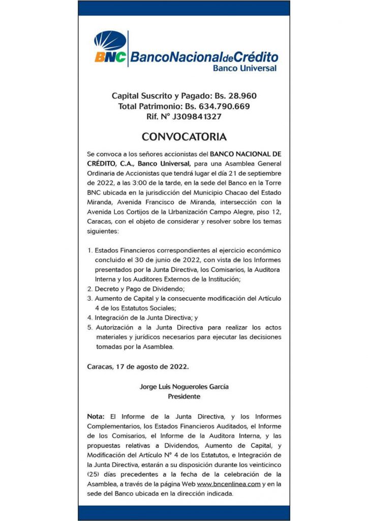 Se convoca a los señores accionistas del BANCO NACIONAL DE CRÉDITO, C.A., Banco Universal, para una Asamblea General Ordinaria de Accionistas que tendrá lugar el día 21 de septiembre de 2022, a las 3:00 de la tarde, en la sede del Banco en la Torre BNC ubicada en la jurisdicción del Municipio Chacao del Estado Miranda, Avenida Francisco de Miranda, intersección con la Avenida Los Cortijos de la Urbanización Campo Alegre, piso 12, Caracas, con el objeto de considerar y resolver sobre los temas siguientes:
