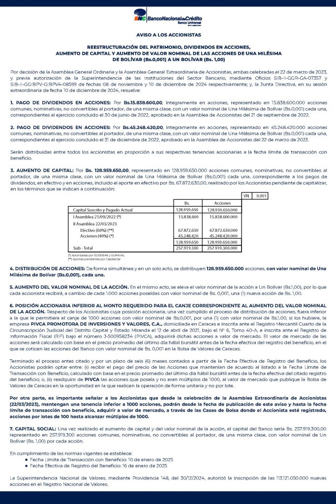 2. PAGO DE DIVIDENDOS EN ACCIONES: Por Bs.45.248.420,00, íntegramente en acciones, representado en 45.248.420.000 acciones comunes, nominativas, no convertibles al portador, de una misma clase, con un valor nominal de Una milésima de Bolívar (Bs.0,001) cada una, correspondientes al ejercicio concluido el 31 de diciembre de 2022, aprobado en la Asamblea de Accionistas del 22 de marzo de 2023.