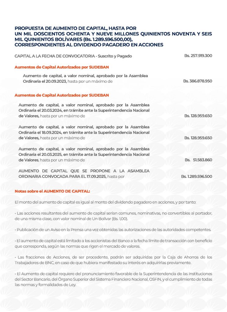 AUMENTO DE CAPITAL QUE PROPONE A LA ASAMBLEA ORDINARIA CONVOCADA PARA EL 17/09/2025 hasta por Bs 1.289.596.500