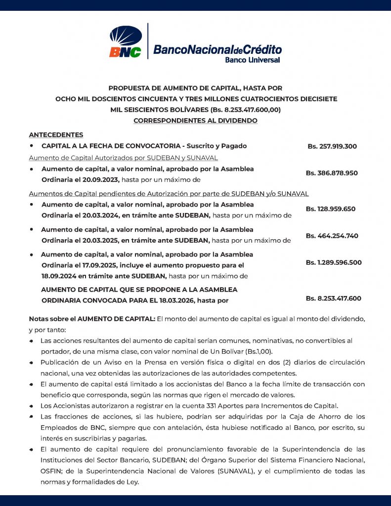 AUMENTO DE CAPITAL QUE SE PROPONE A LA ASAMBLEA ORDINARIA CONVOCADA PARA EL 18.03.2026, hasta por Bs 8.253.417.600.