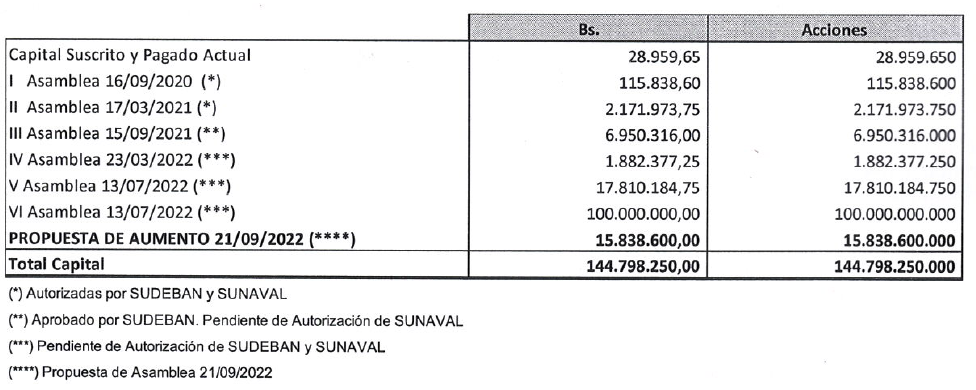 Tercero. La Asamblea por unanimidad aprobó, el Aumento de Capital propuesto hasta por Bs 15.838.600,00, que resultaría como consecuencia necesaria del pago del dividendo en acciones. Las nuevas acciones resultantes del aumento de capital serían comunes, nominativas, no convertibles al portador, de una misma clase, con valor nominal de Bs 0,001 por acción. Obtenidas las respectivas autorizaciones de SUDEBAN, la situación del capital sería: