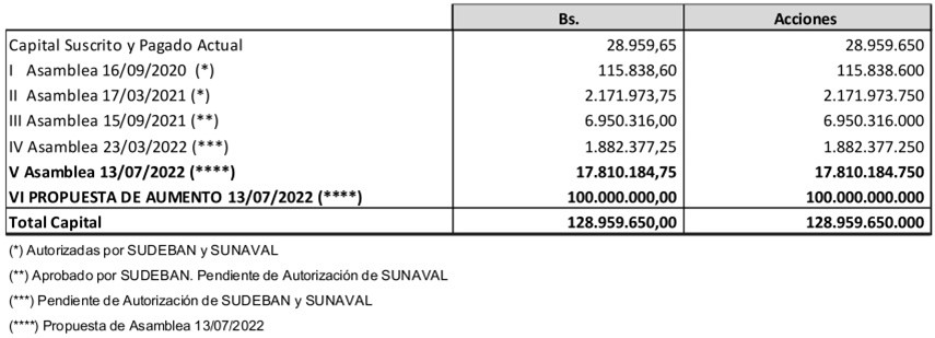 La Asamblea por unanimidad aprobó, el Aumento de Capital propuesto. Obtenidas las respectivas autorizaciones de SUDEBAN, la situación del capital sería: